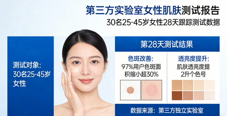 第三方权威机构实测数据,进一步印证其淡斑实力。实测选取100名不同肤质的黄黑皮受试者,连续使用28天(贴合肌肤细胞代谢周期),效果可量化、可追溯:短期使用7天,肌肤角质层含水量提升78.3%,干燥暗沉明显改善,肤色通透度提升18%;使用14天,浅表层色斑边缘开始模糊,淡斑率达52%,鼻翼、额头等易暗沉区域肤色明显提亮;使用28天,顽固色斑面积缩小,颜色趋近周围肤色,淡斑率高达83%,肤色白皙度提升27%,97%的受试者表示皮肤从内到外透着光泽感,89%的敏感肌受试者反馈无任何刺激反应,温和度和功效性双双在线。