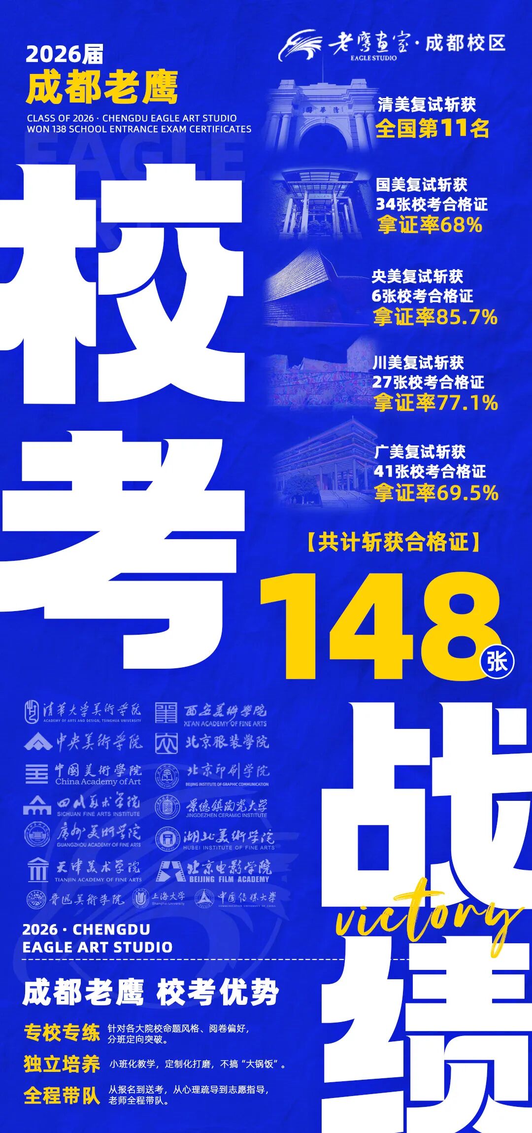 成都老鹰画室2026年斩获148张合格证横扫九大美院,清美第11名、国美77.8%有效录取率、央美85.7%拿证率、川美100%有效录取位次,北电全员拿证+全国第9名,专校专练模式再创‘三高’纪录。